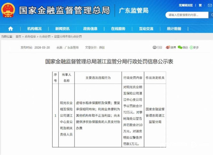 3月20日,国家金融监督管理总局湛江监管分局行政处罚决定书显示,阳光农业相互保险公司(下称“阳光农险”)湛江中心支公司因多项违法违规行为合计被罚72万元。在农业保险从“扩面”转向“提质”的关键节点,这张罚单再度敲响合规警钟。